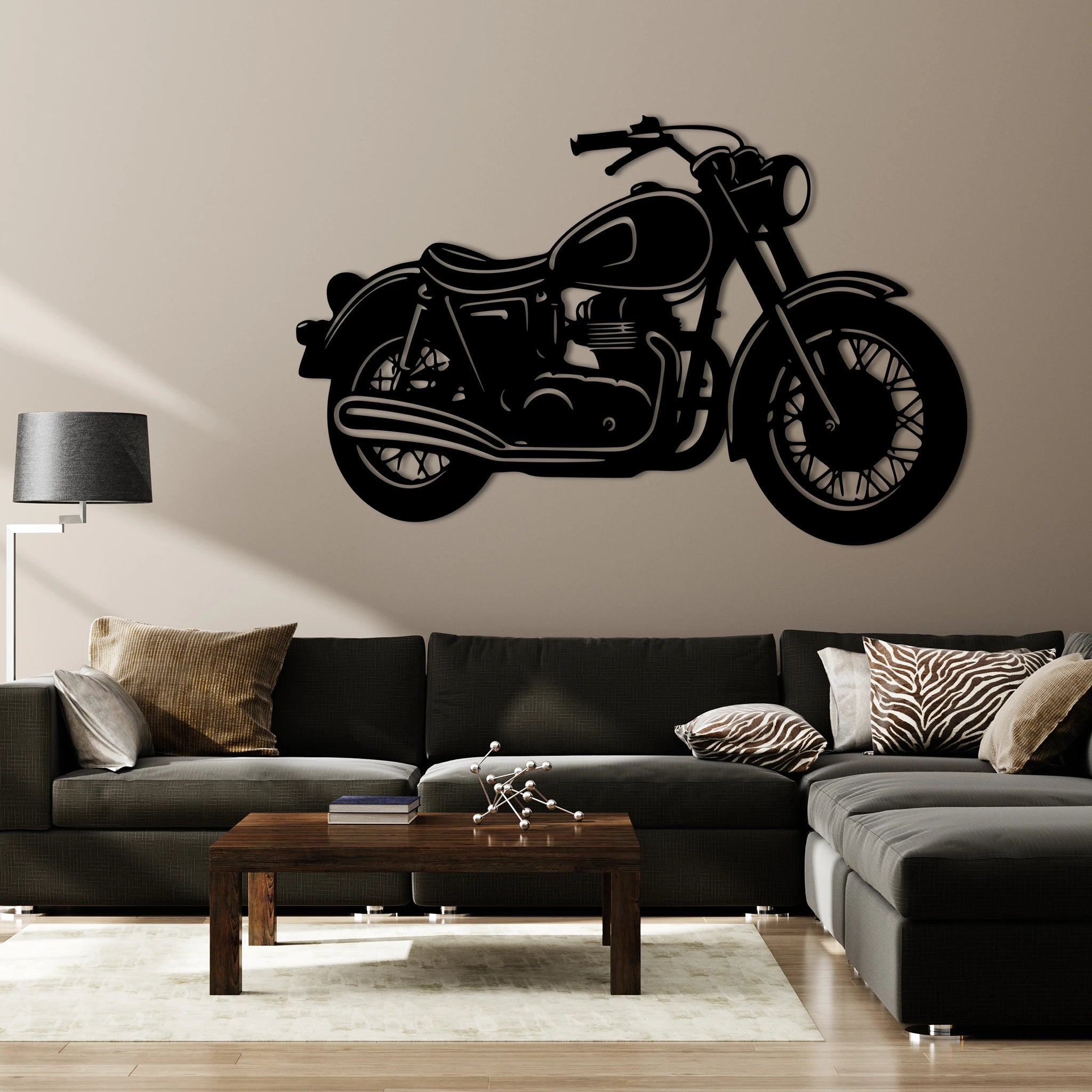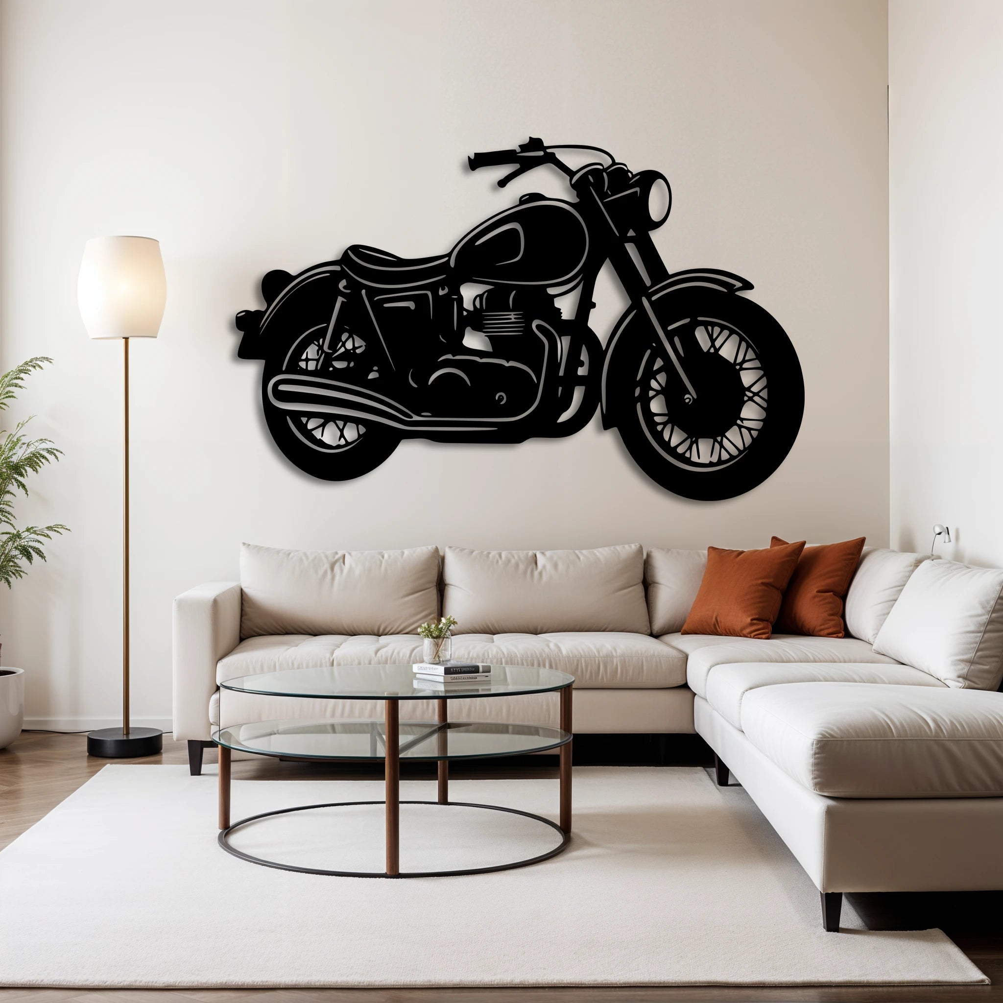 The vintage motorcycle silhouette is expertly cut from premium steel, enhanced with a smooth electrostatic powder coating. Perfect for enthusiasts and collectors, it brings dynamic character and industrial charm to your decor.