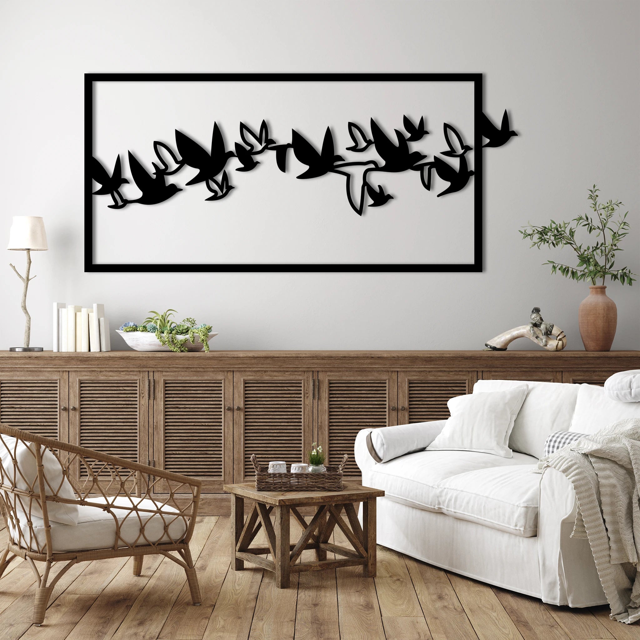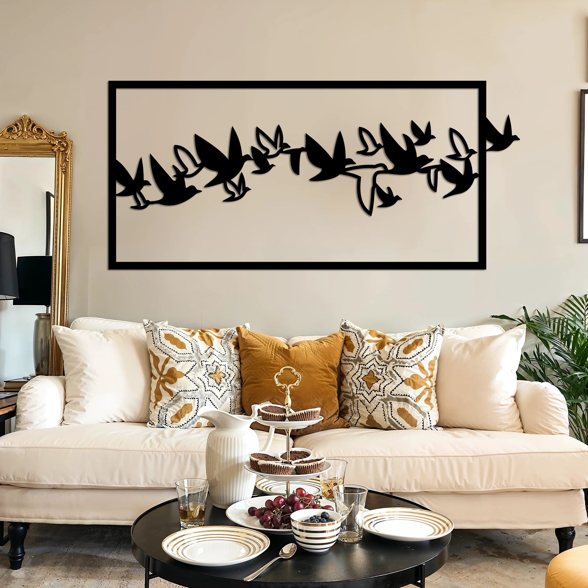 Bring movement and elegance to your walls with this exquisitely crafted metal wall art, showcasing a graceful flock of soaring birds. The minimalist, modern design creates a dynamic visual effect, making it a perfect focal point for any living room, bedroom, or office.