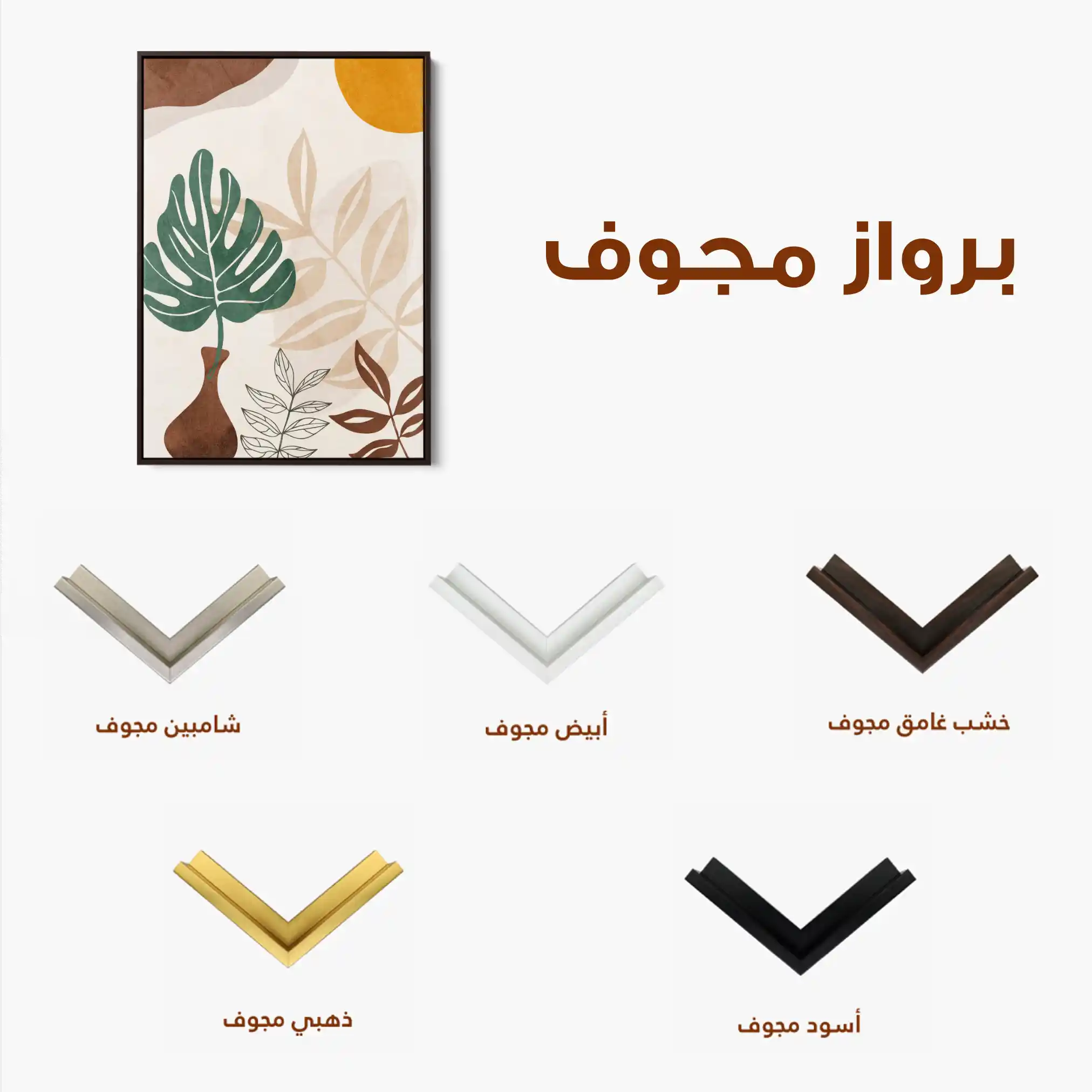 • الإطار (مجوف): إطار نحيف بفراغ رفيع يحيط باللوحة ليُبرز الحافة ويمنح ظلاً خفيفاً وإحساس صالات العرض؛ يصل جاهزاً للتعليق.